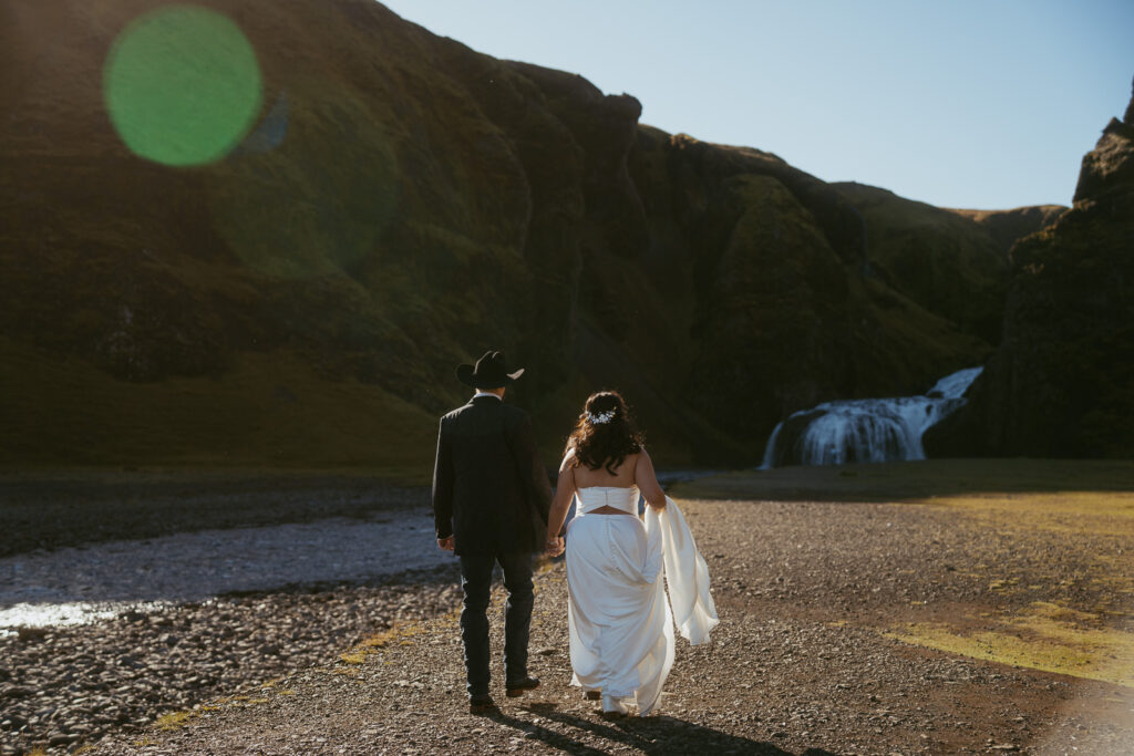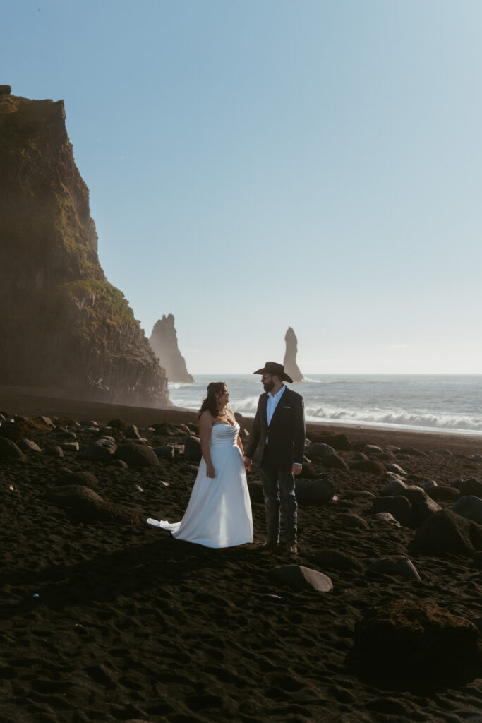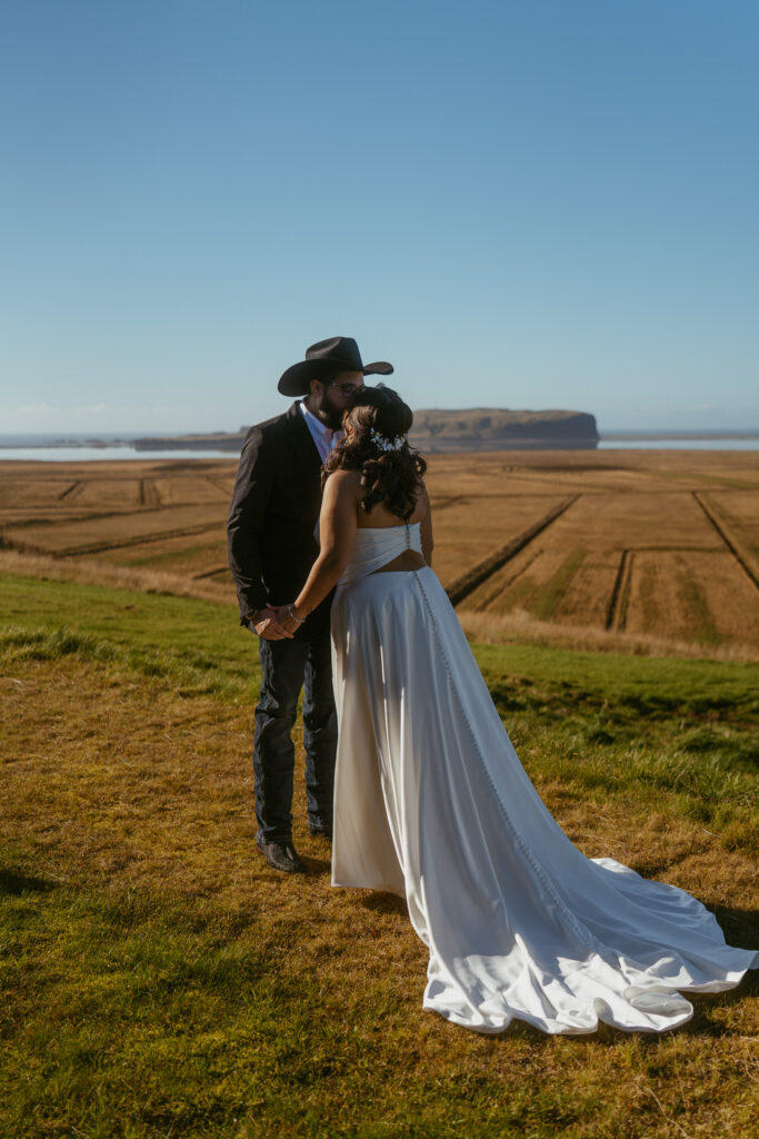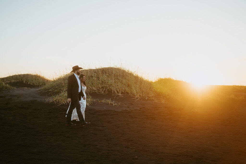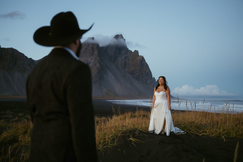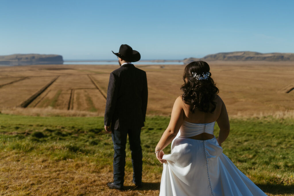 We started the morning at Black Sand Suites, where Cathy and Sheldon got ready and shared their first look in the bright late-September sun. The light was golden and warm (as warm as Iceland gets), and you could already feel how special the day would be. He wore his cowboy hat and boots — a little Texas touch that somehow felt right at home against the Icelandic backdrop.