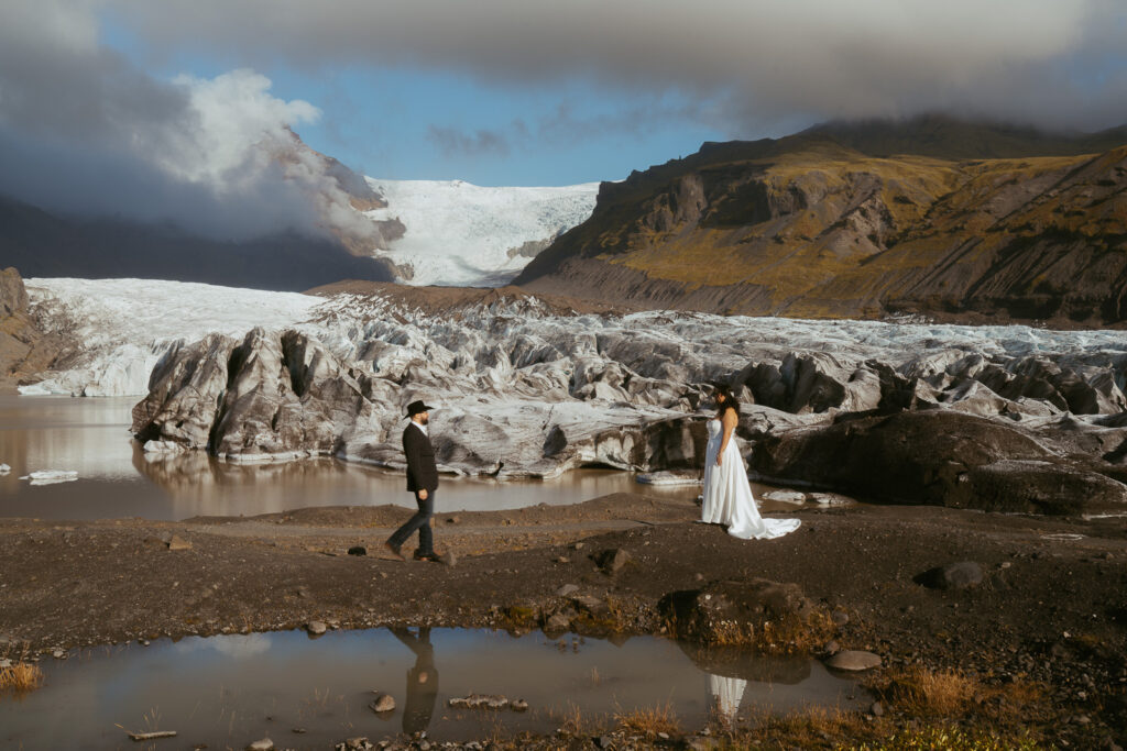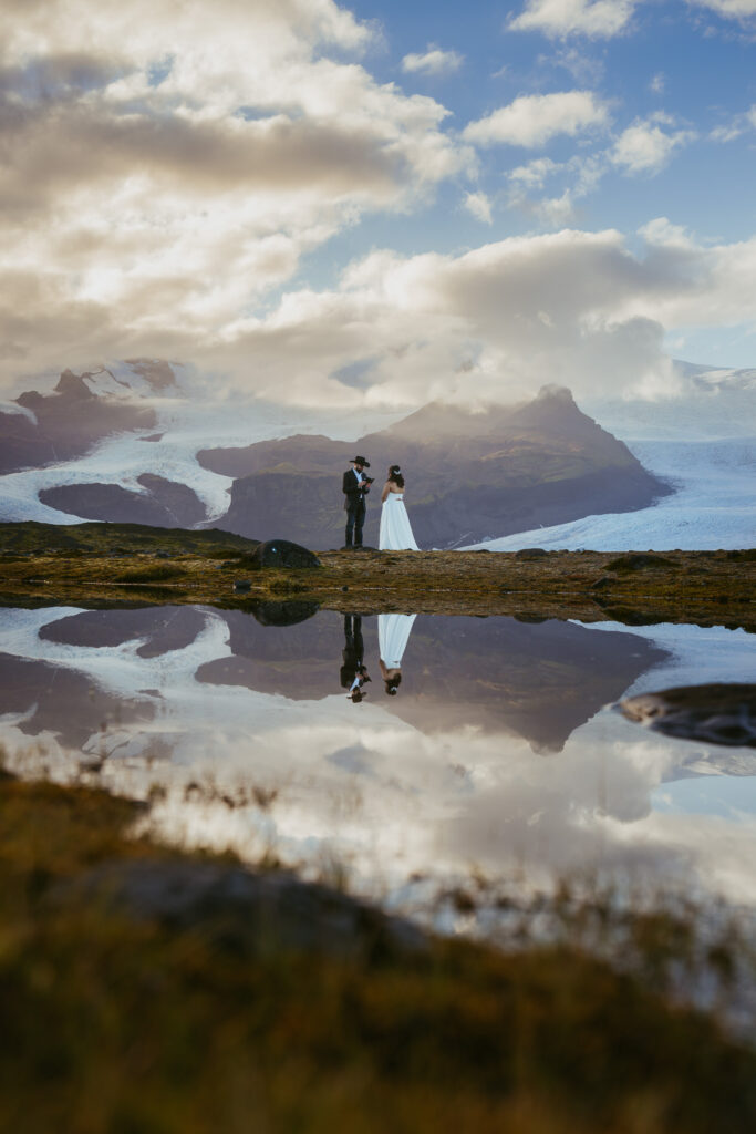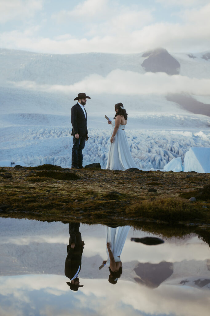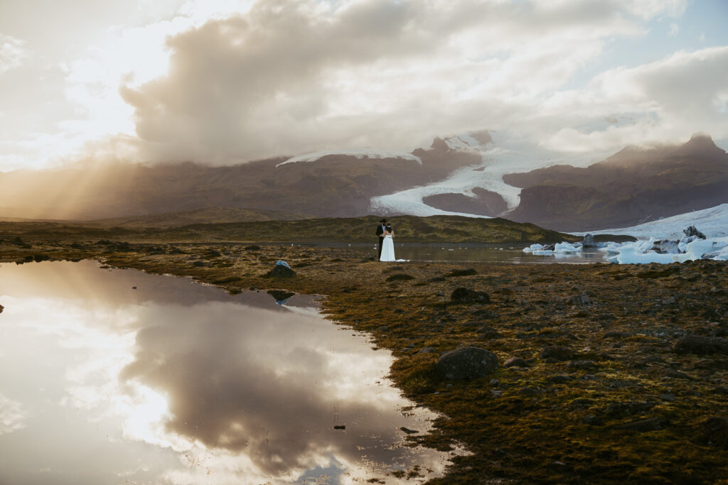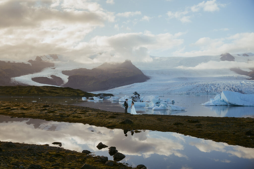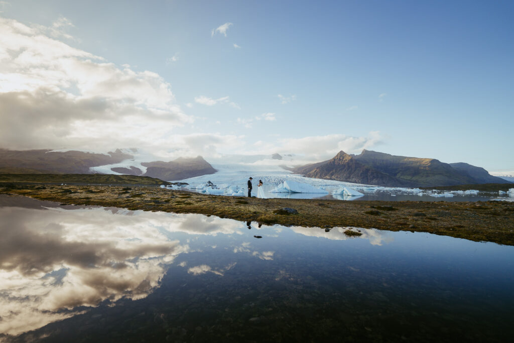 Later, Cathy and Sheldon exchanged their vows at Fjallsárlón Glacier Lagoon, standing by a small pond, which without wind, gave a beautiful reflection of them.