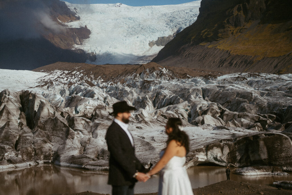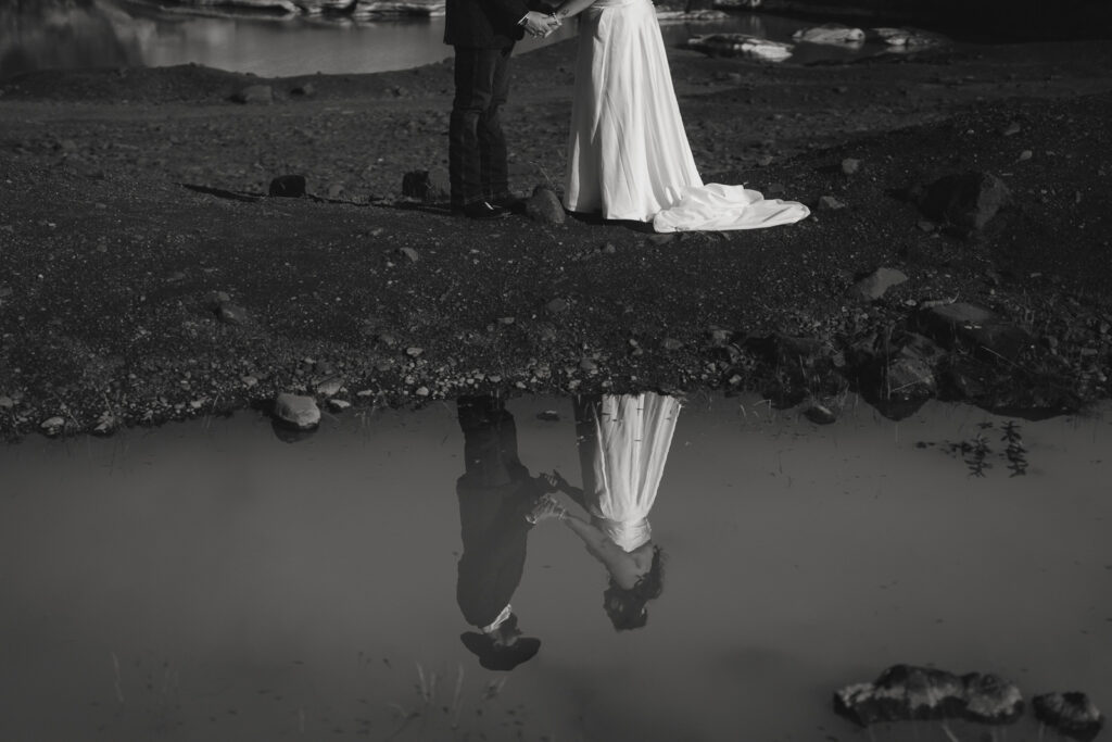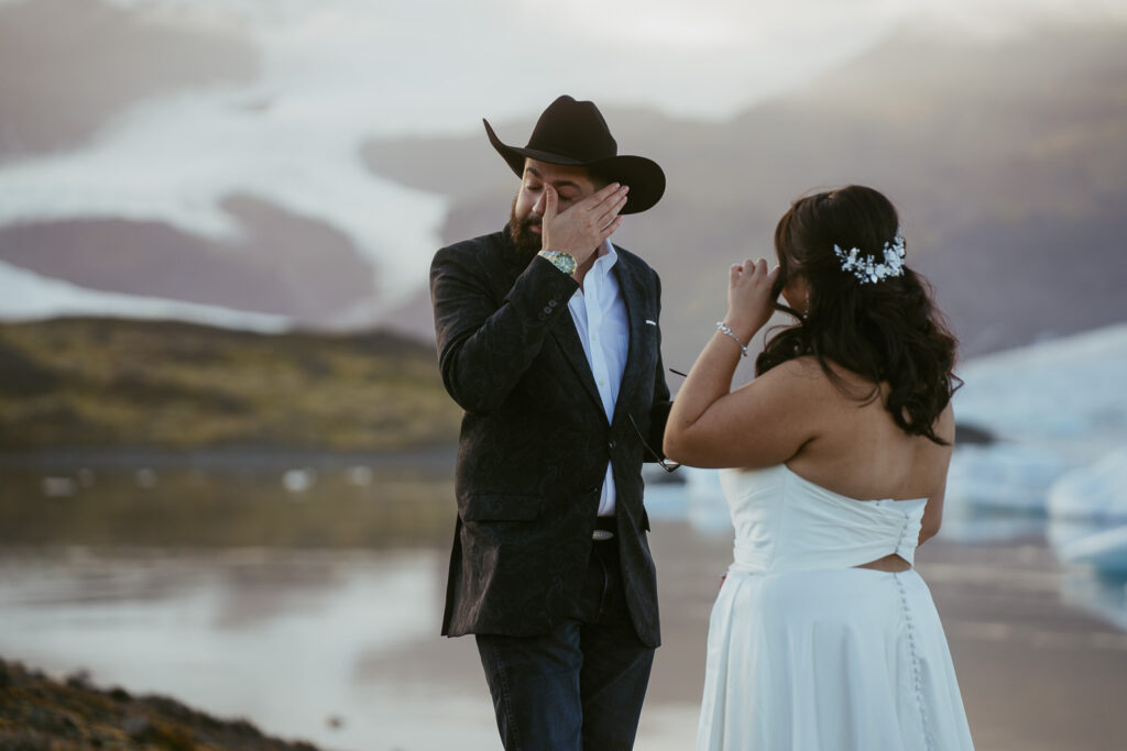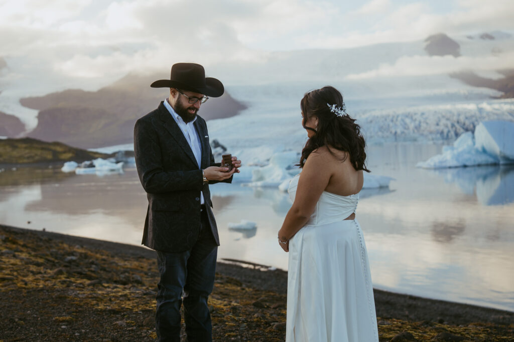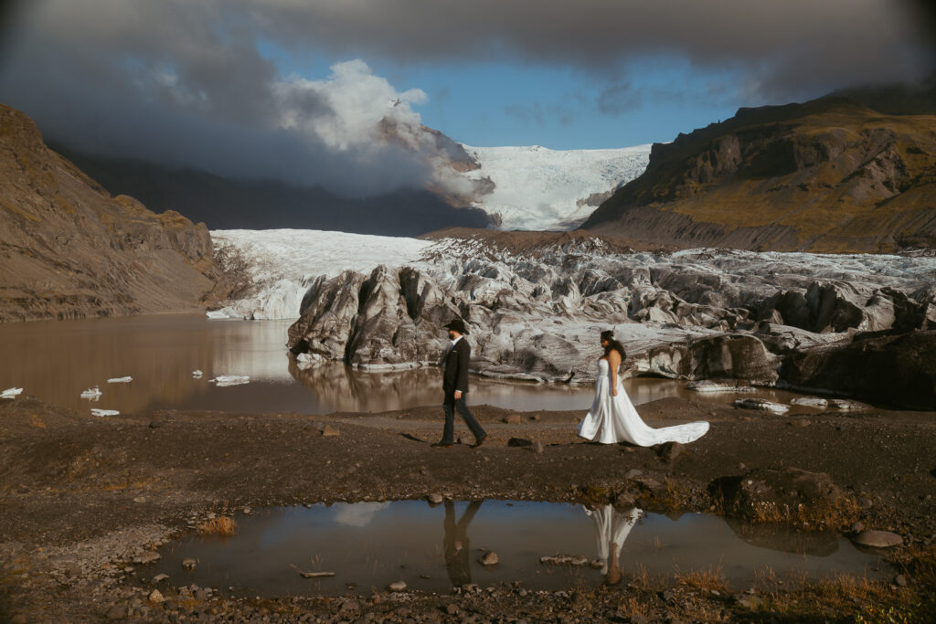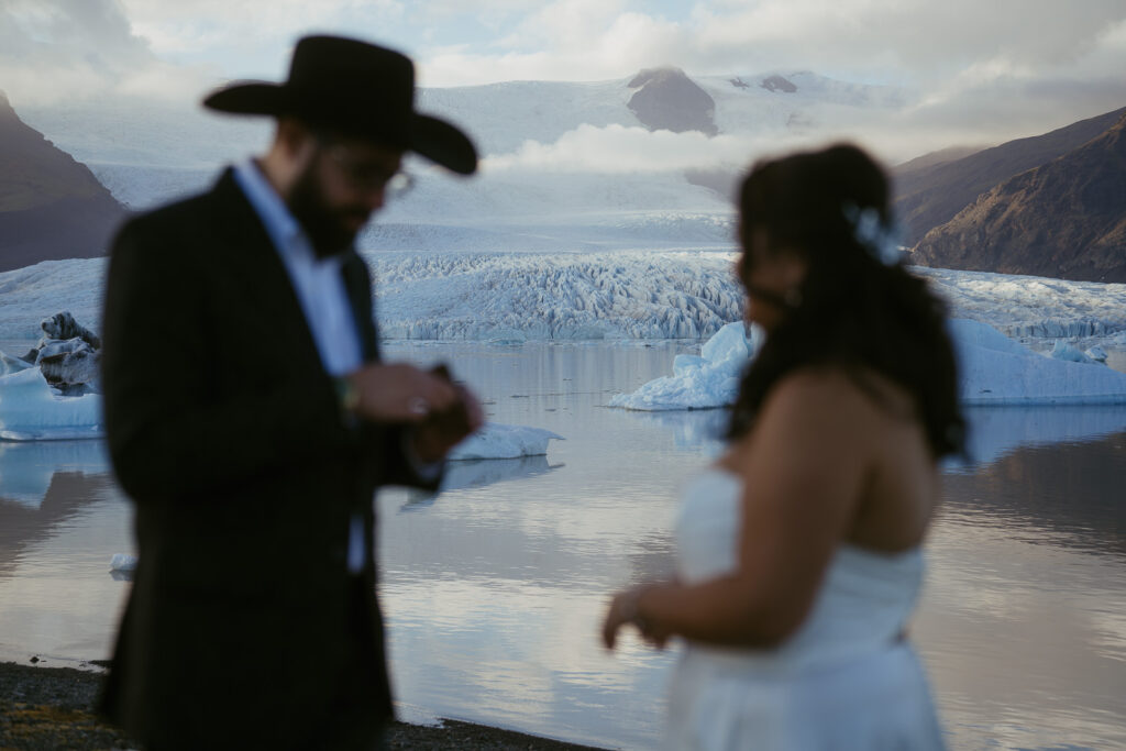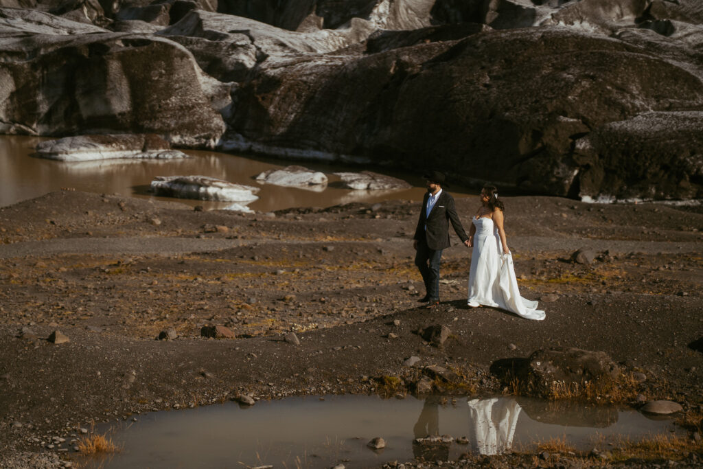 Later, Cathy and Sheldon exchanged their vows at Fjallsárlón Glacier Lagoon, standing by a small pond, which without wind, gave a beautiful reflection of them.