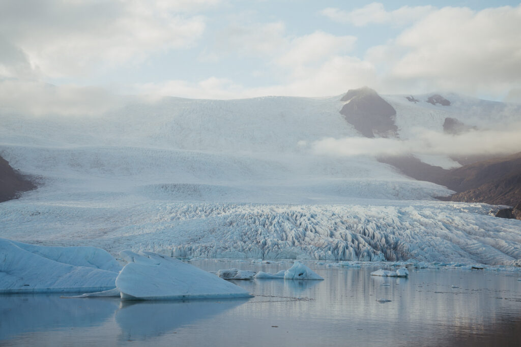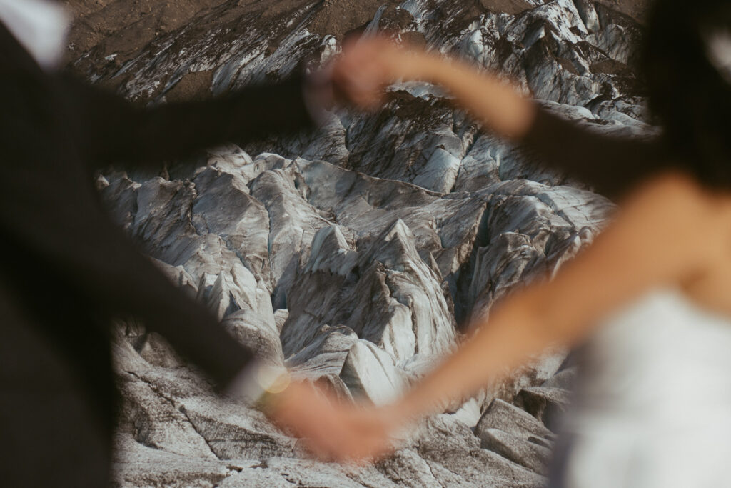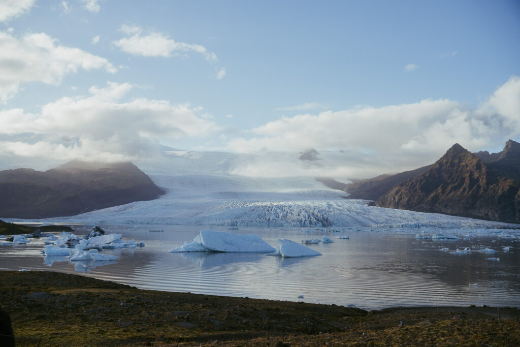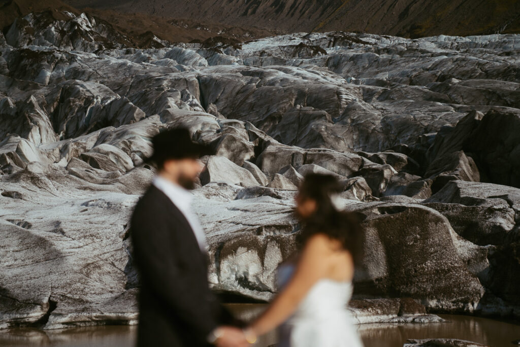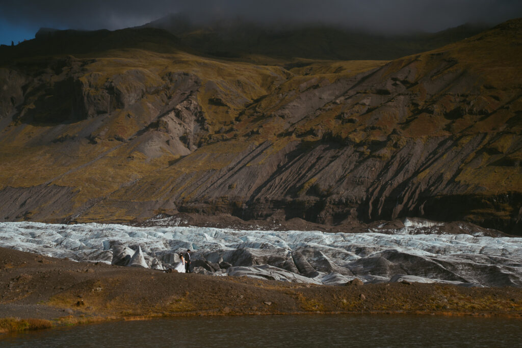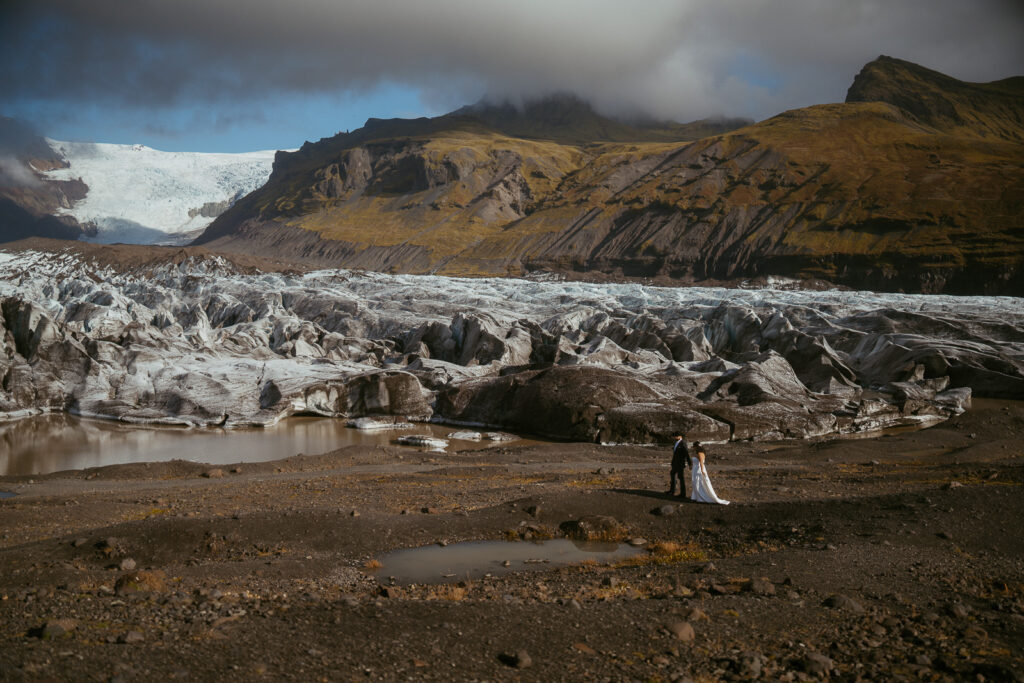 Later, Cathy and Sheldon exchanged their vows at Fjallsárlón Glacier Lagoon, standing by a small pond, which without wind, gave a beautiful reflection of them.