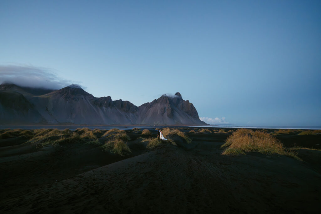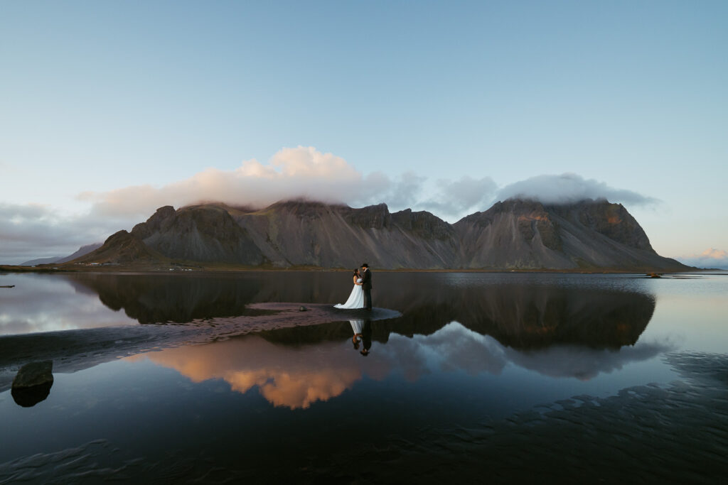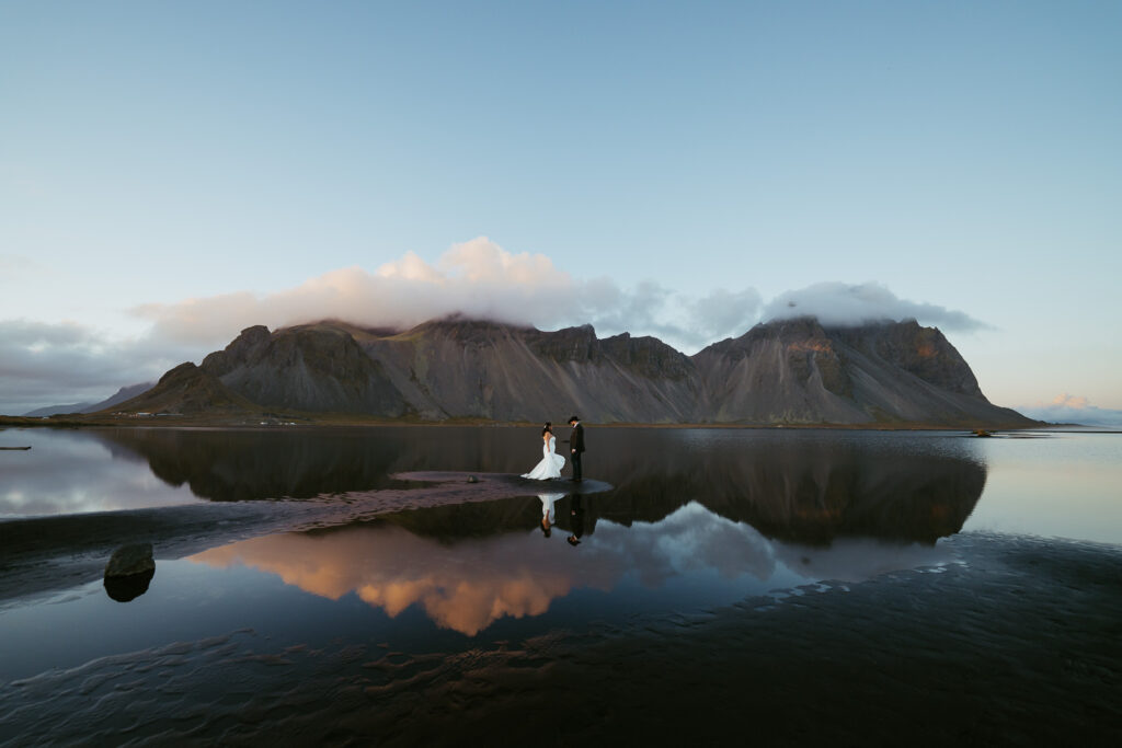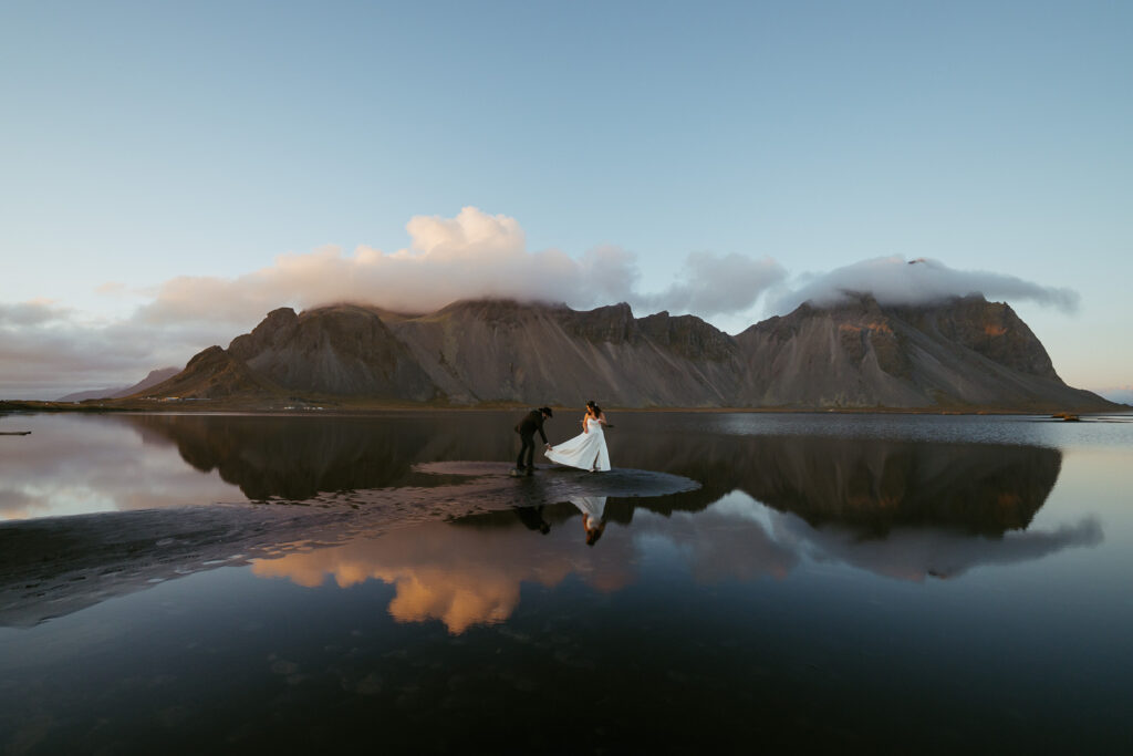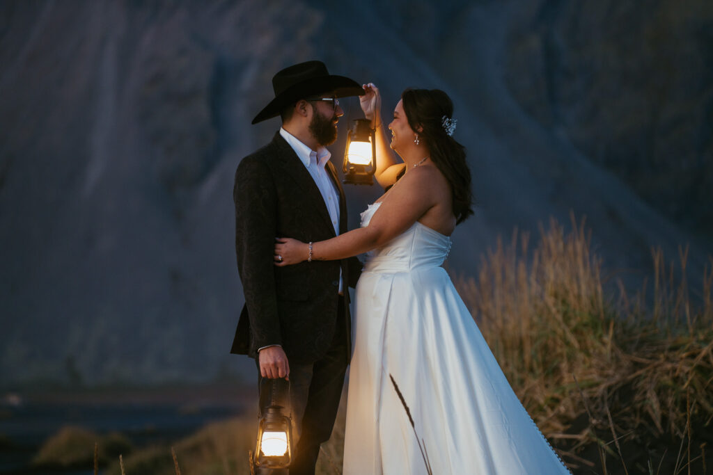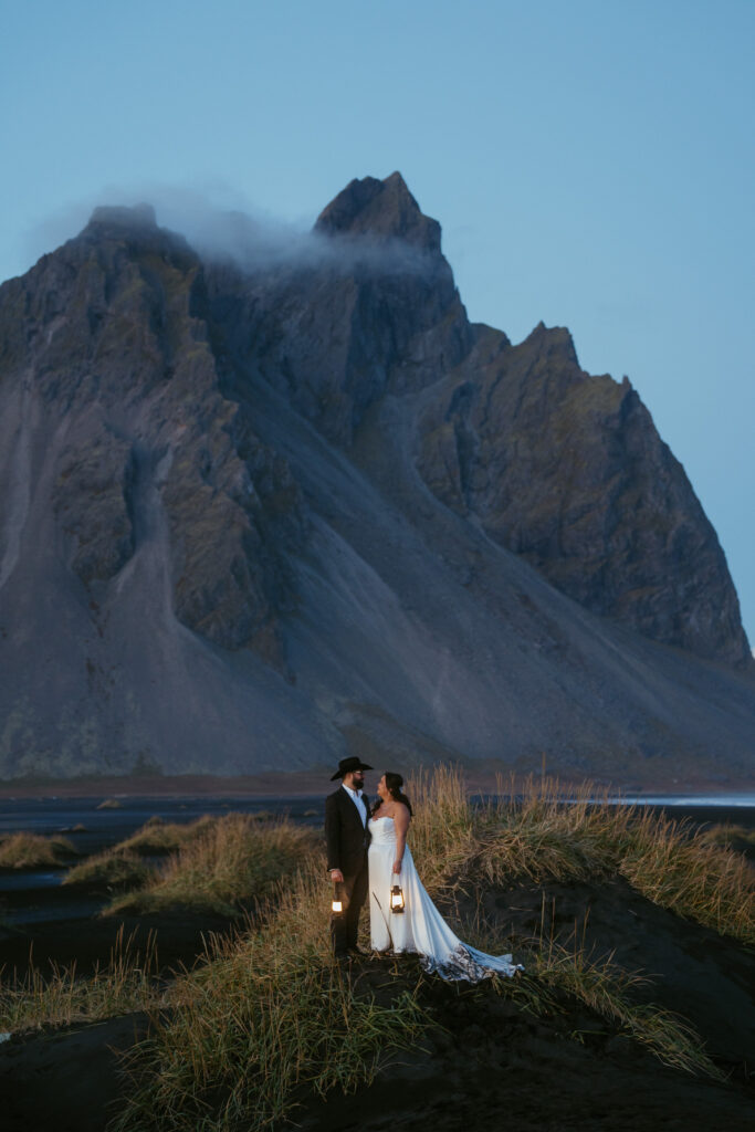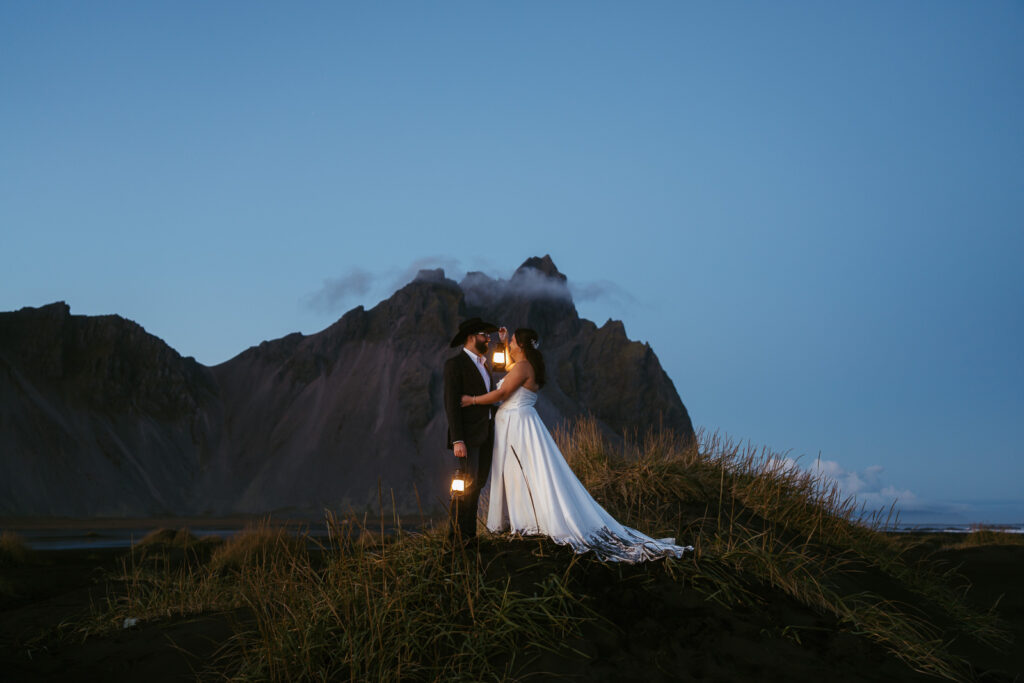 We ended the day at Vestrahorn, one of my favorite places in Iceland for elopements. The pond in front of the dunes gave us beautiful reflections again, and as the temperature cooled, they lit lanterns and watched the last light fade.