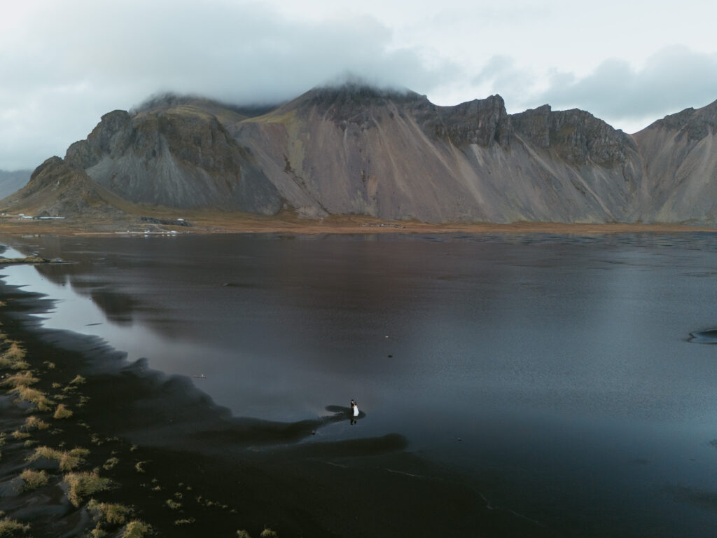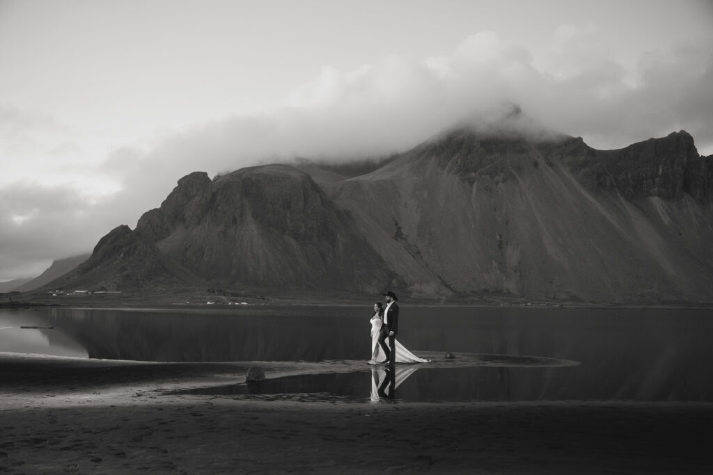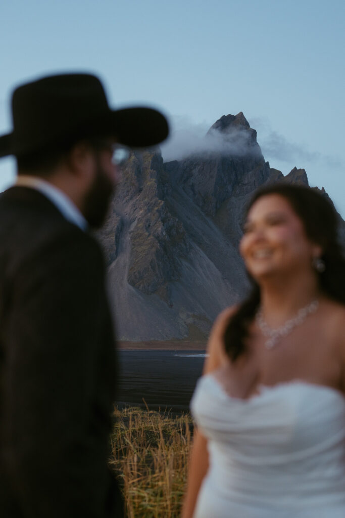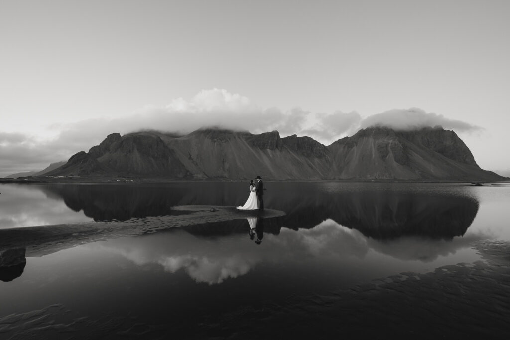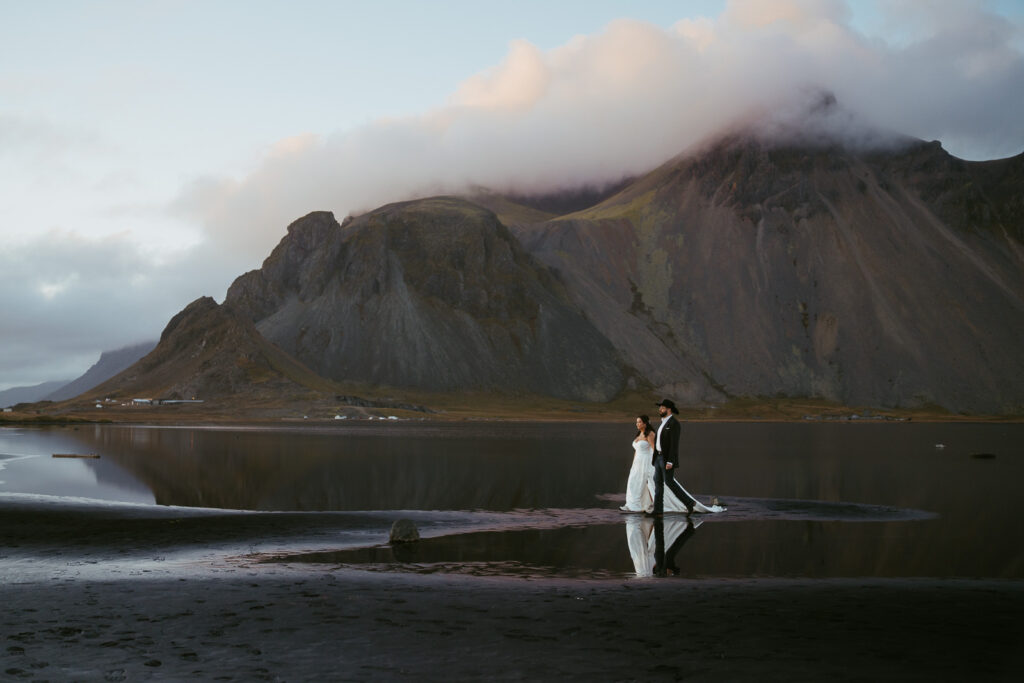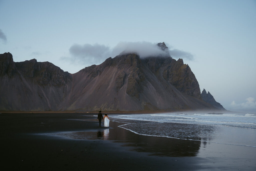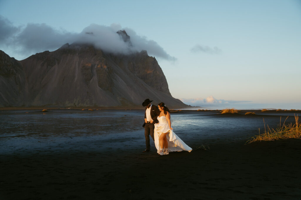 We ended the day at Vestrahorn, one of my favorite places in Iceland for elopements. The pond in front of the dunes gave us beautiful reflections again, and as the temperature cooled, they lit lanterns and watched the last light fade.