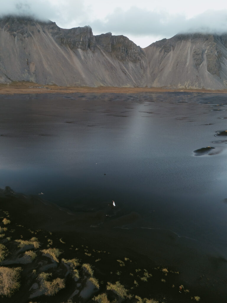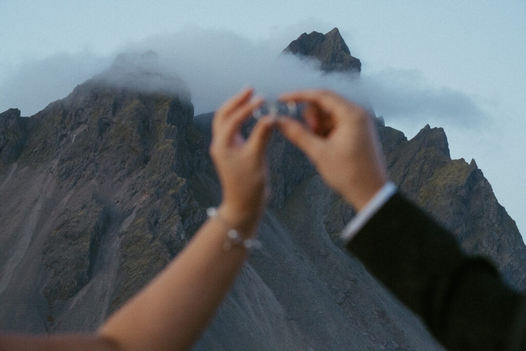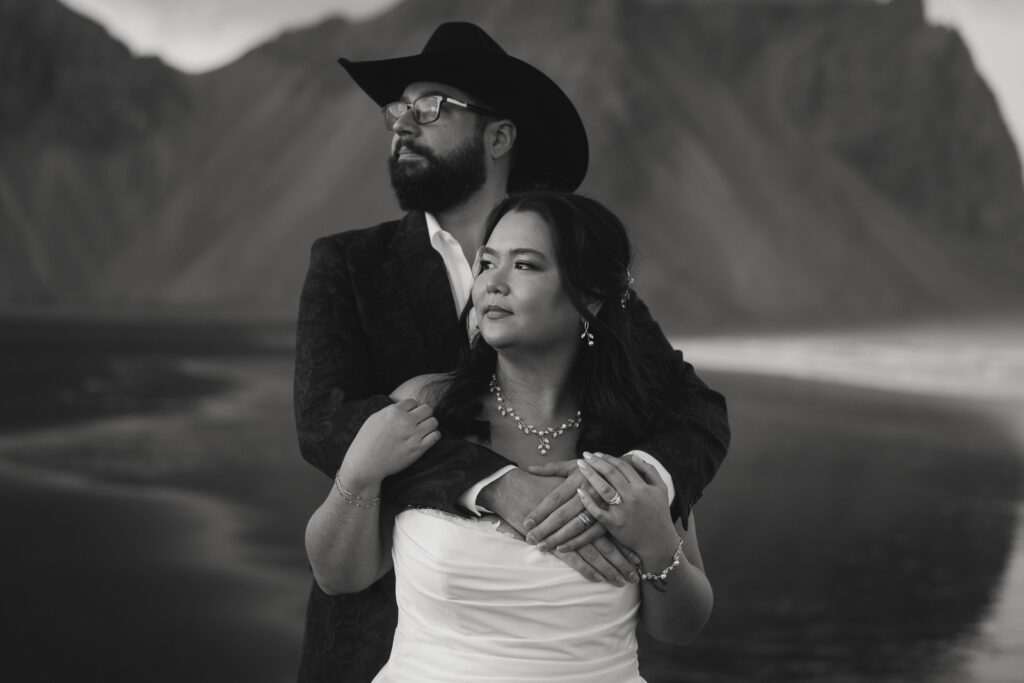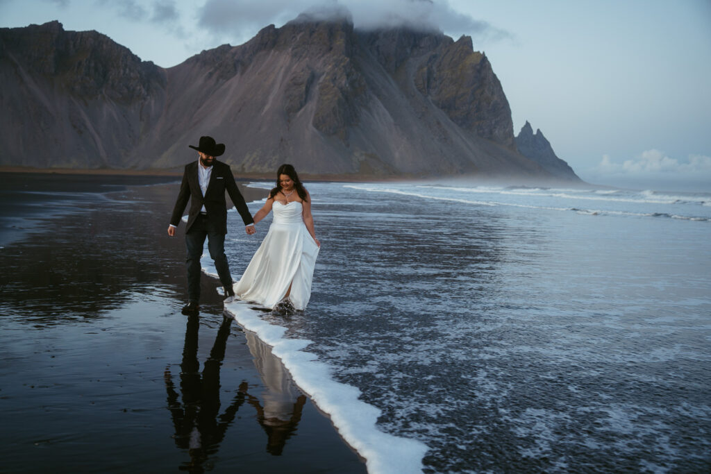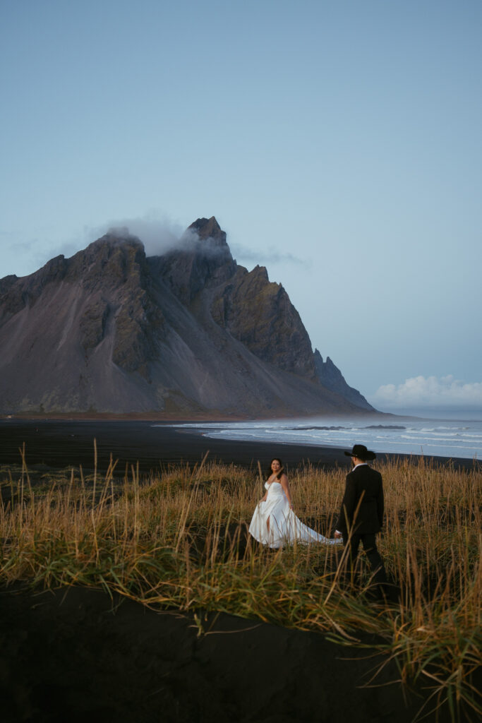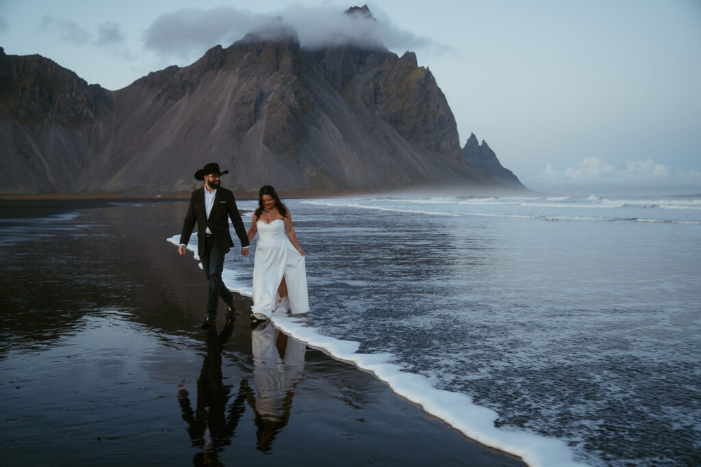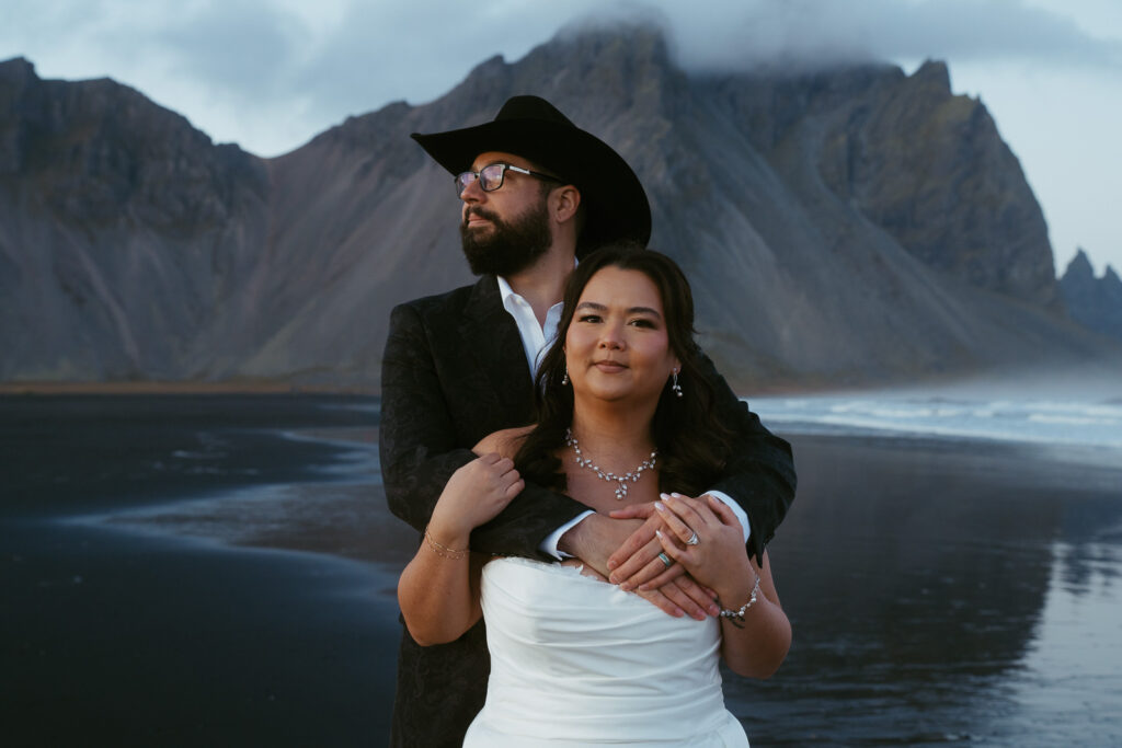 We ended the day at Vestrahorn, one of my favorite places in Iceland for elopements. The pond in front of the dunes gave us beautiful reflections again, and as the temperature cooled, they lit lanterns and watched the last light fade.